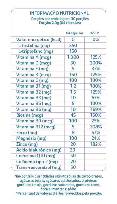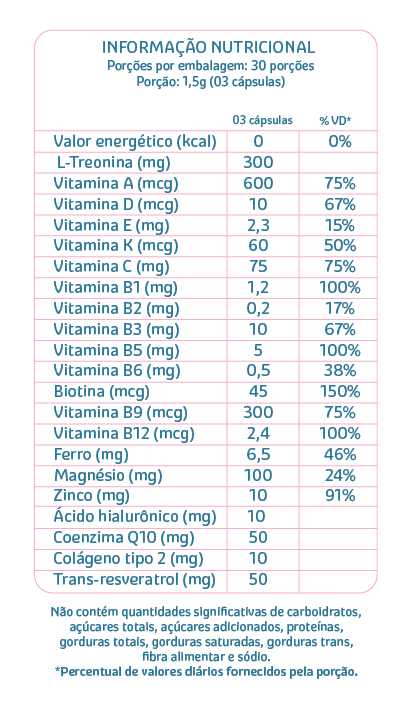 Este suplemento é especialmente formulado para mulheres com 30 anos, ou mais, que desejam cuidar da saúde e prevenir o envelhecimento precoce. Contém Treonina, um aminoácido essencial que é importante para a absorção de nutrientes e para a produção de colágeno e elastina, que são fundamentais para a saúde da pele, cabelos e unhas.