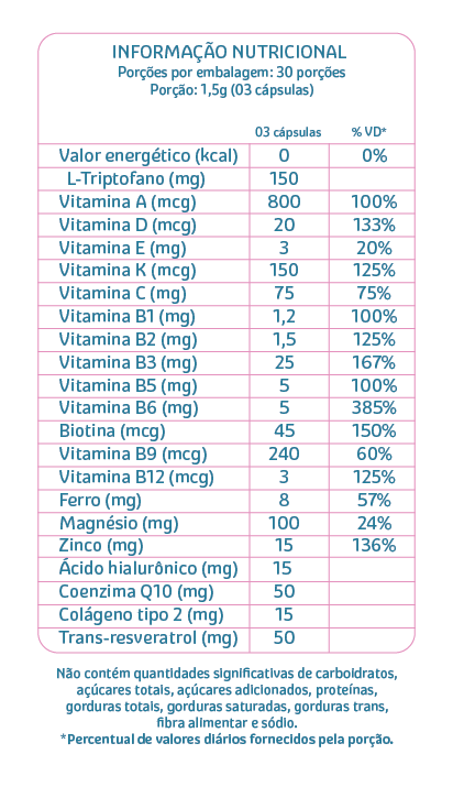 O suplemento também contém Coenzima Q10, um antioxidante que protege as células contra os danos causados pelos radicais livres e ajuda na produção de energia celular. E o trans-Resveratrol, outro poderoso antioxidante encontrado em uvas e vinho tinto, que ajuda a prevenir o envelhecimento precoce.